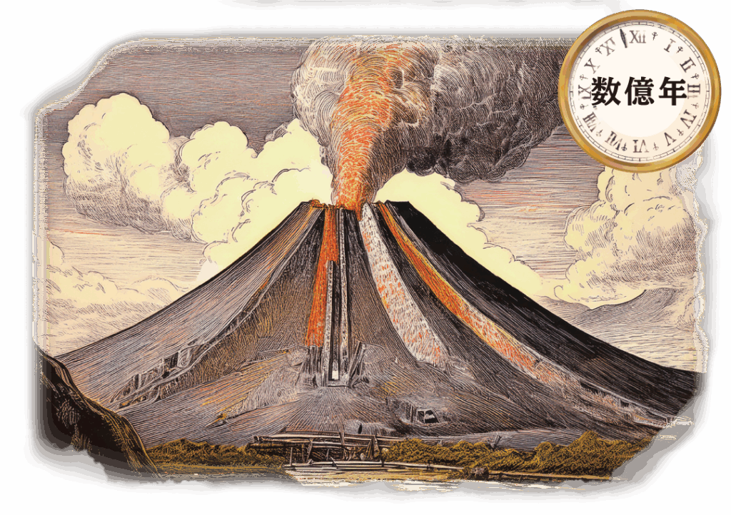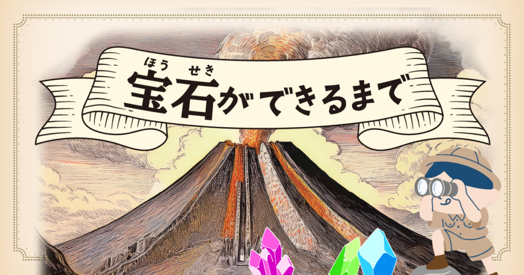 地球の深いところに、ドロドロに溶けた「マグマ」っていう熱い液体があるよ。これがゆっくり冷えて固まるときに、宝石の元になる結晶ができるんだ。ガスのようなものも混ざって、キラキラの石になるよ。