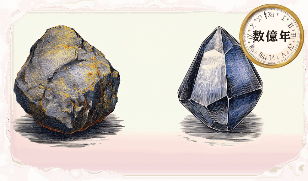 すでにできた岩石が、地球の動きで高温や高圧にかかると、形が変わって新しい宝石になるよ。まるで岩石が変身するみたい!