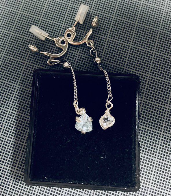 「形も大きさも、色合いもちがうけど、同じブルートパーズ💎」ということで、アシンメトリーなデザイン✨