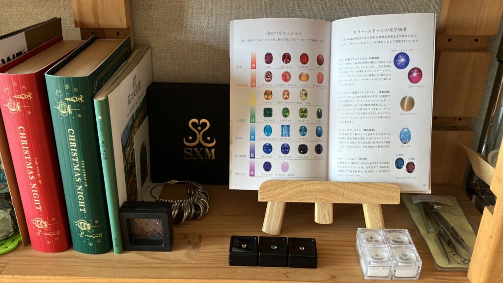 石のコレクションだけではなくガイドブックやレンズ付きルースケースなど、石をより楽しむアイテムも側に飾ってあるのも素敵ですね✨