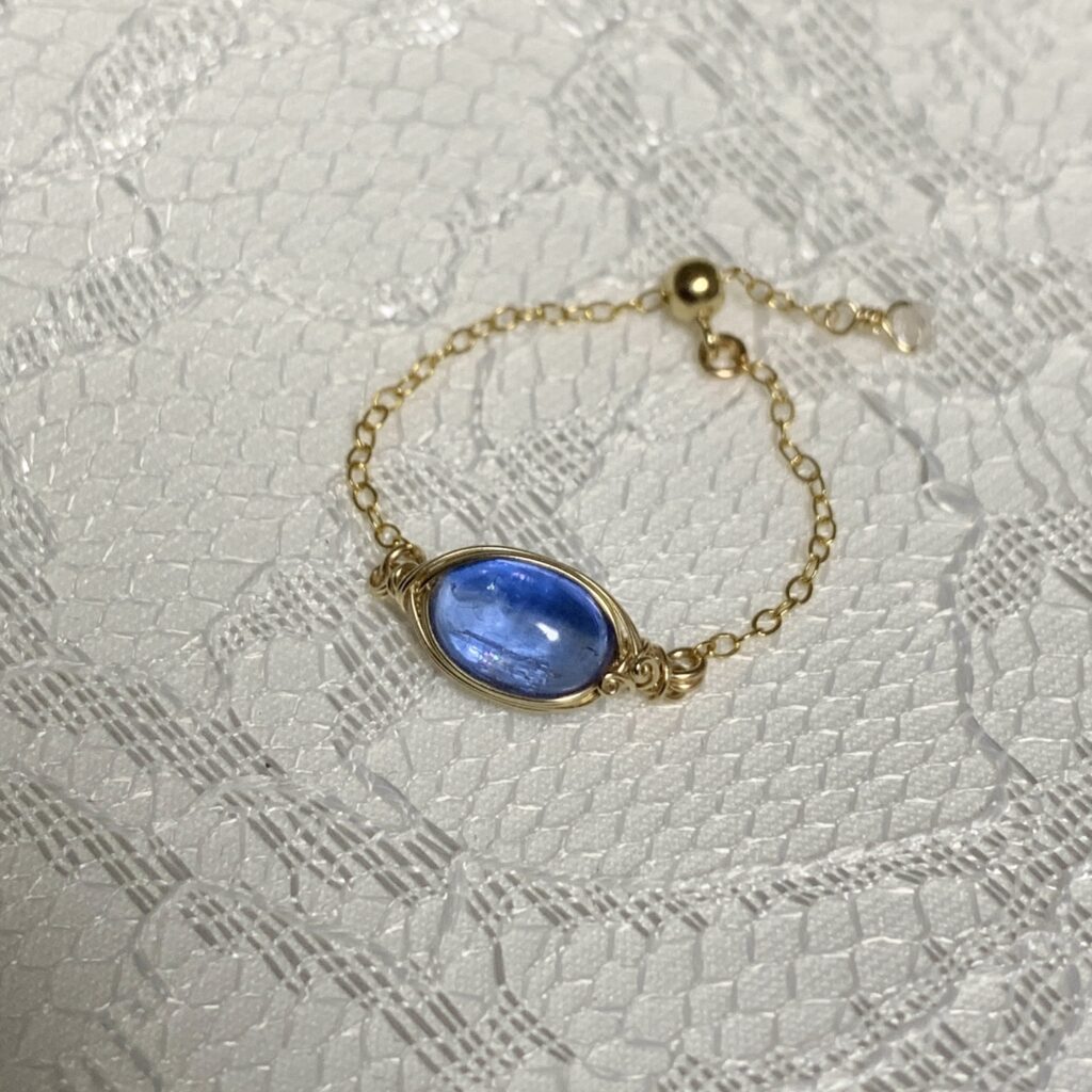 カボションのカイヤナイトを、ゴールドのワイヤーで包みこんだチェーンリング💎