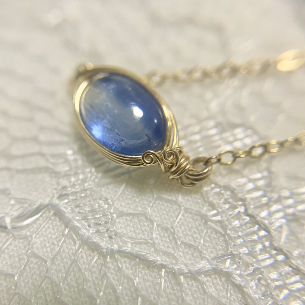 カイヤナイトのやわらかいブルーと、曲線の美しいワイヤーのあしらいの相性がぴったりですね😌
