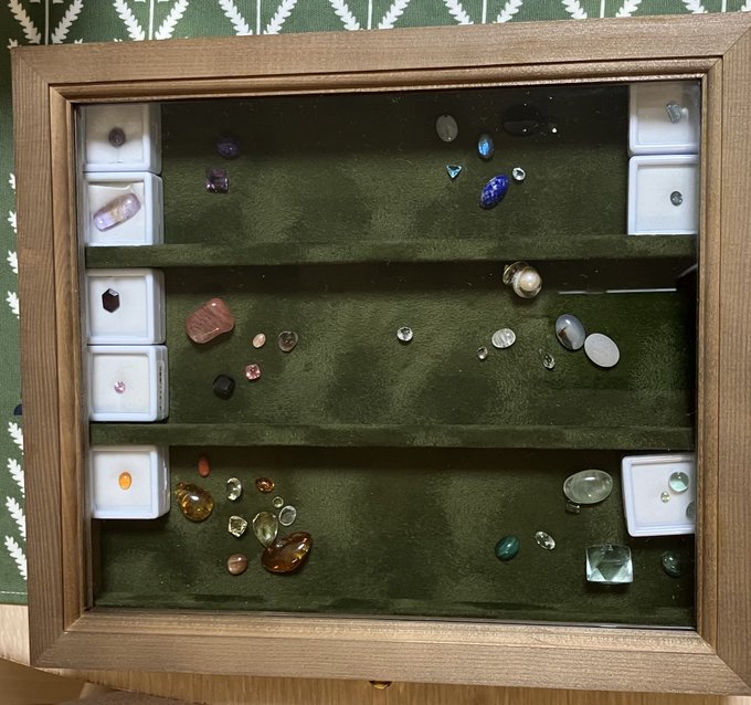 木製のケースが額縁のようにも見えて、さらにベロア生地が敷かれていることで品のあるアートのような収納法✨