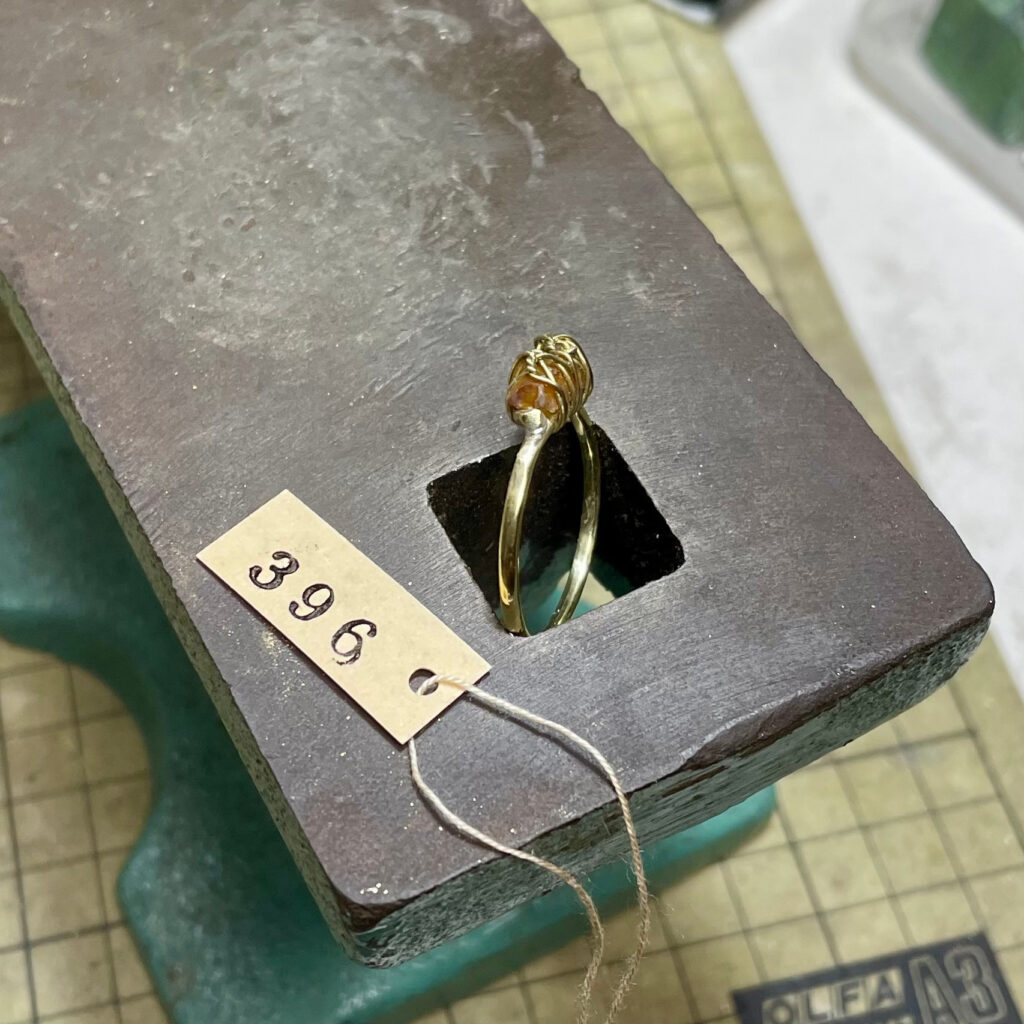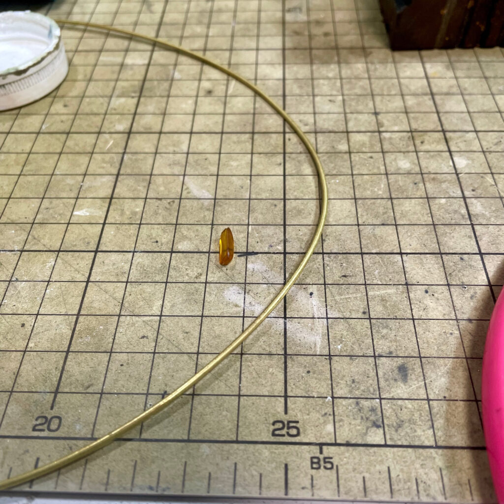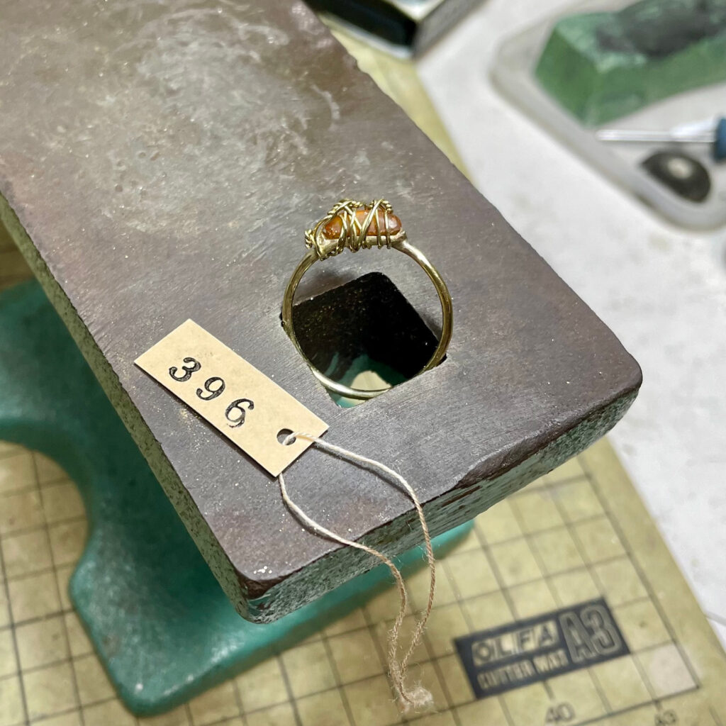今回はとりあえず何点か捻って無理やり留めてあります。火を使わない(ロウ付けしない)でリング状にすることができ、かつ石留めもできるワイヤークラフトは今後練習したいところでもあります。