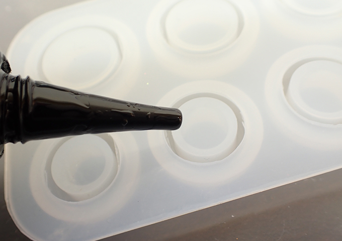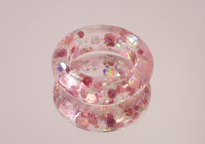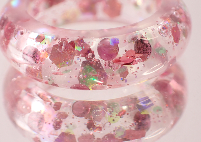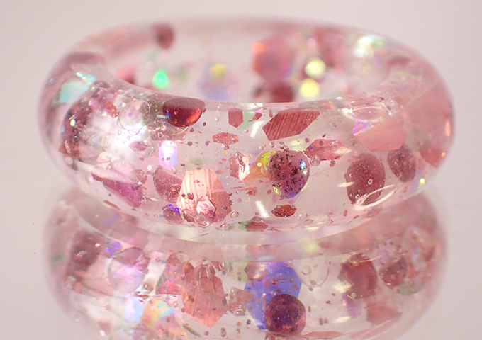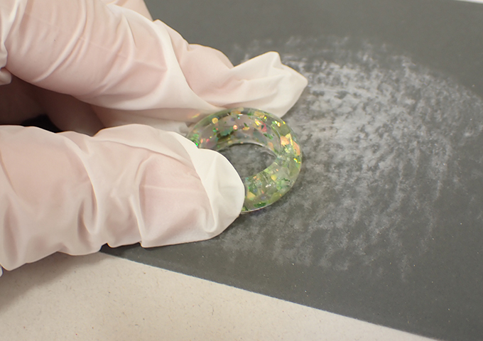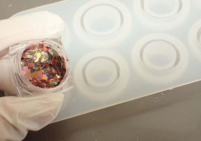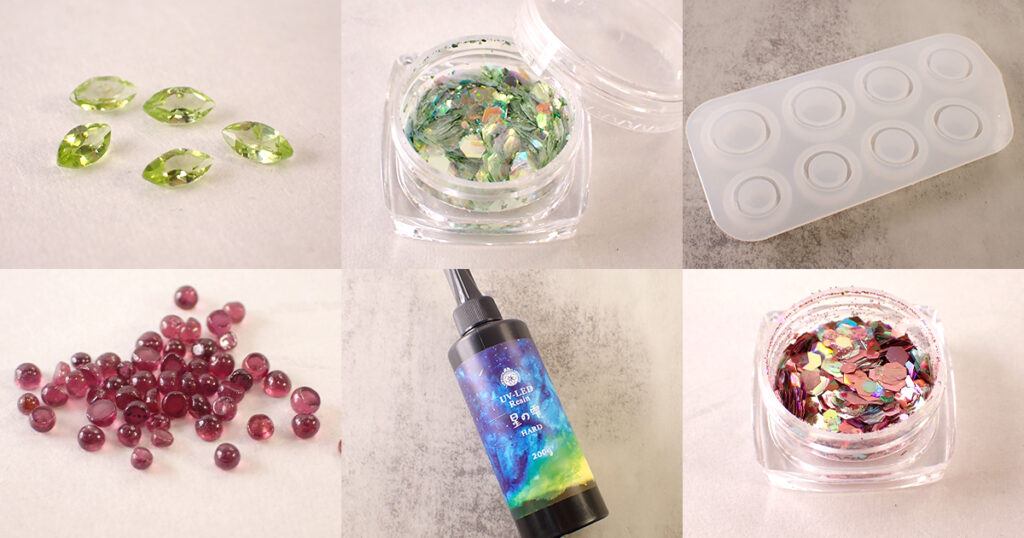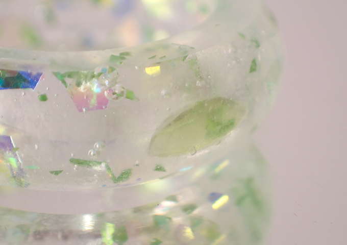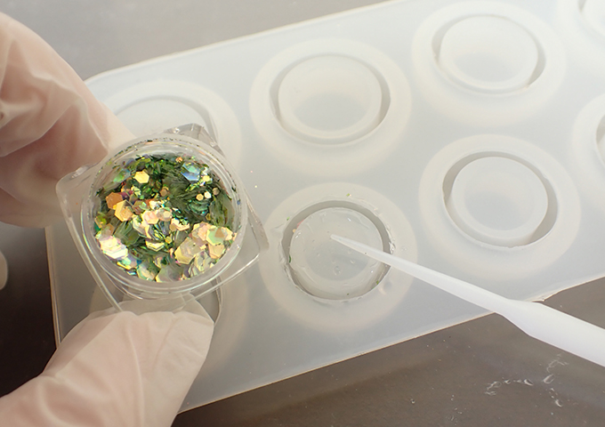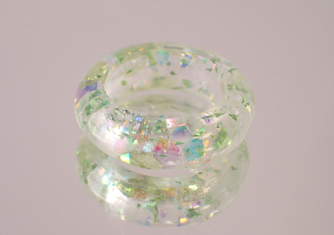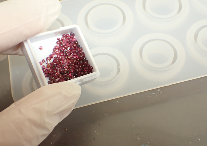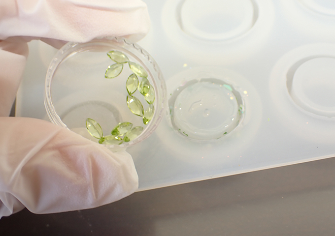 ペリドットリングも同様に素材を配置しレジンを流し込みます。