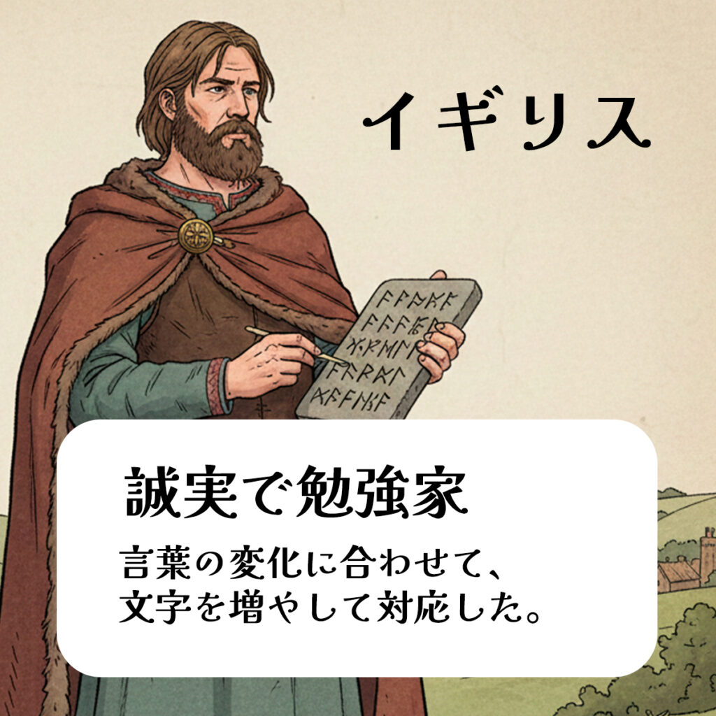 ドイツの方からイギリスへ渡った人々は、現地の言葉に合わせて文字を使いやすく改造したそうです。