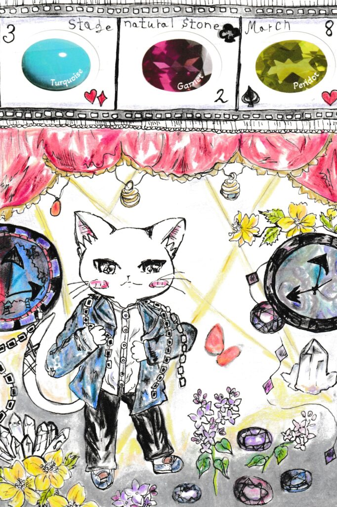 かっこいい猫ちゃんが演技しながらクリスタルや色々な天然石を飾りながら一生懸命頑張ってる姿を描いてみました